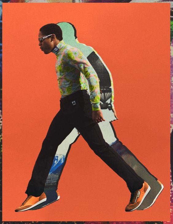 I loved how she accentuated movement through a simple cutout and shift. She also keeps a bit of the subject in the orange background to draw attention to the cutout. Then has a very analog, unsaturated background behind the orange that compliments the models top. It’s so cool.