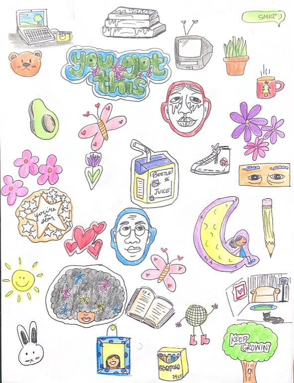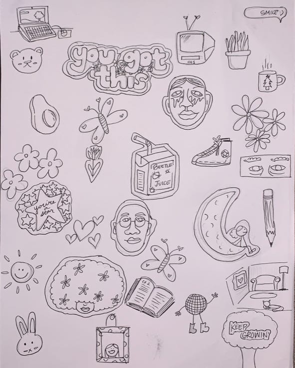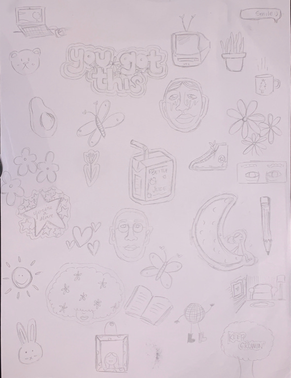 Step 1: The first step of this challenge requires you to use a blank sheet of paper and a pencil. On the sheet of paper draw anything that you would like or that first comes to your mind. If you need inspiration for doodles to draw I use Pinterest, it can be difficult to come up with what you want to draw. There isn’t a specific amount of drawings that you need to fill up the page, I just kept drawing until I filled most of the page but feel free to draw as much as you’d like. Overall, treat this drawing as if you were doodling in a notebook.