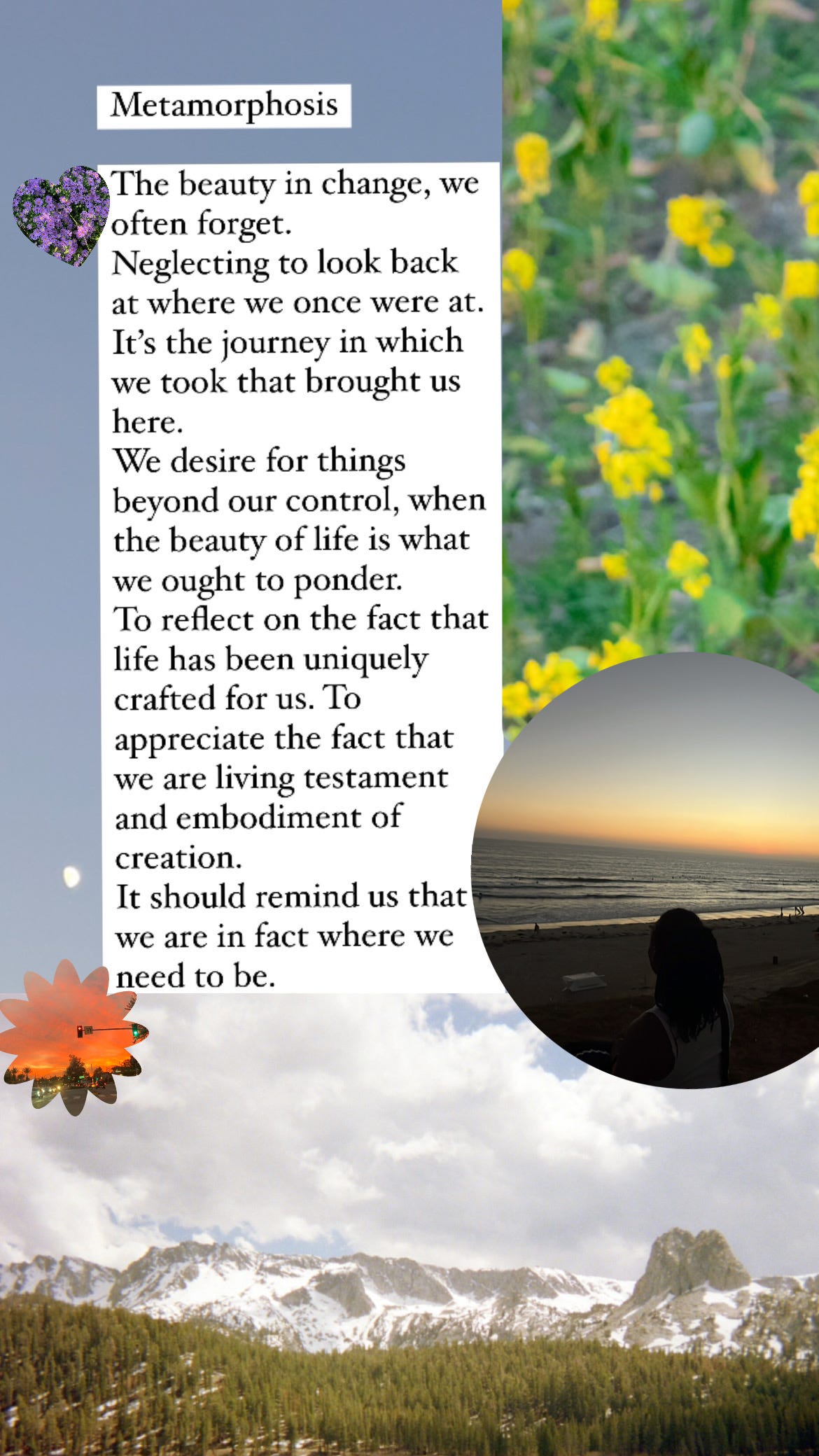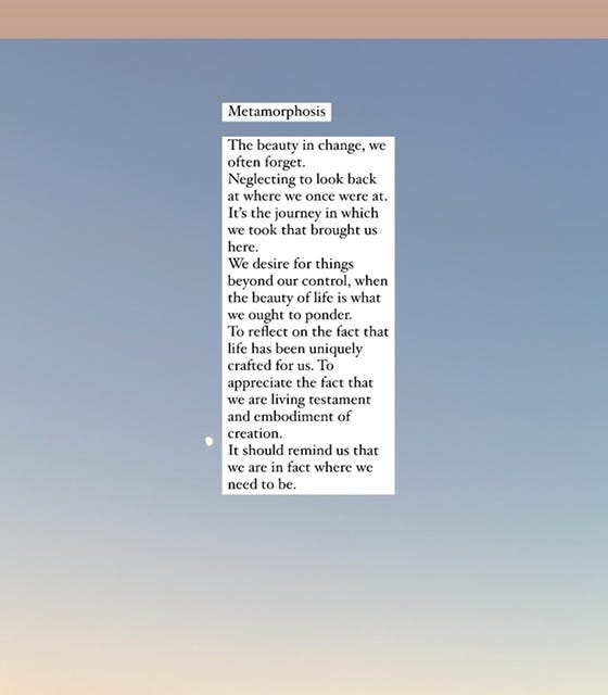 We all have different perspectives. When thinking of metamorphosis I was generally thinking about transitions I go through in life and enjoying the beauty of it. However, you might have a different perception or understanding of it, and that’s okay!