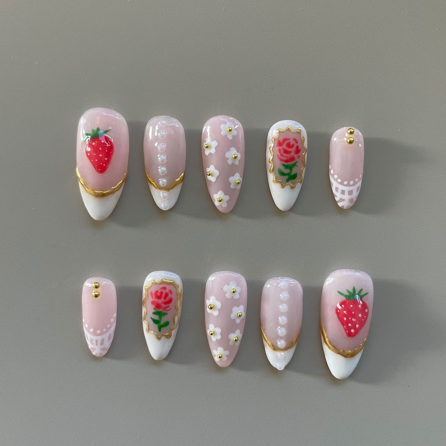 I was inspired by the porcelain plates of English tea parties with the white and gold contrasting each other as well as floral and strawberry motifs. I wanted each nail to have some white and gold in it to tie the set together. I also used complementary colors (red and green) to be used on two out of five nails to give the set a bit of pop. The pearls were an added touch because I do feel like women would be wearing their pearls to afternoon tea!