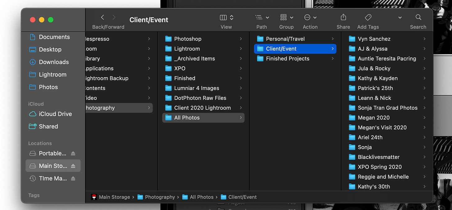 Switching over to my Client/Event photography, all of them are categorized into various event/client names. This helps me quickly spot a folder or easily search it if I need to export the RAW files.