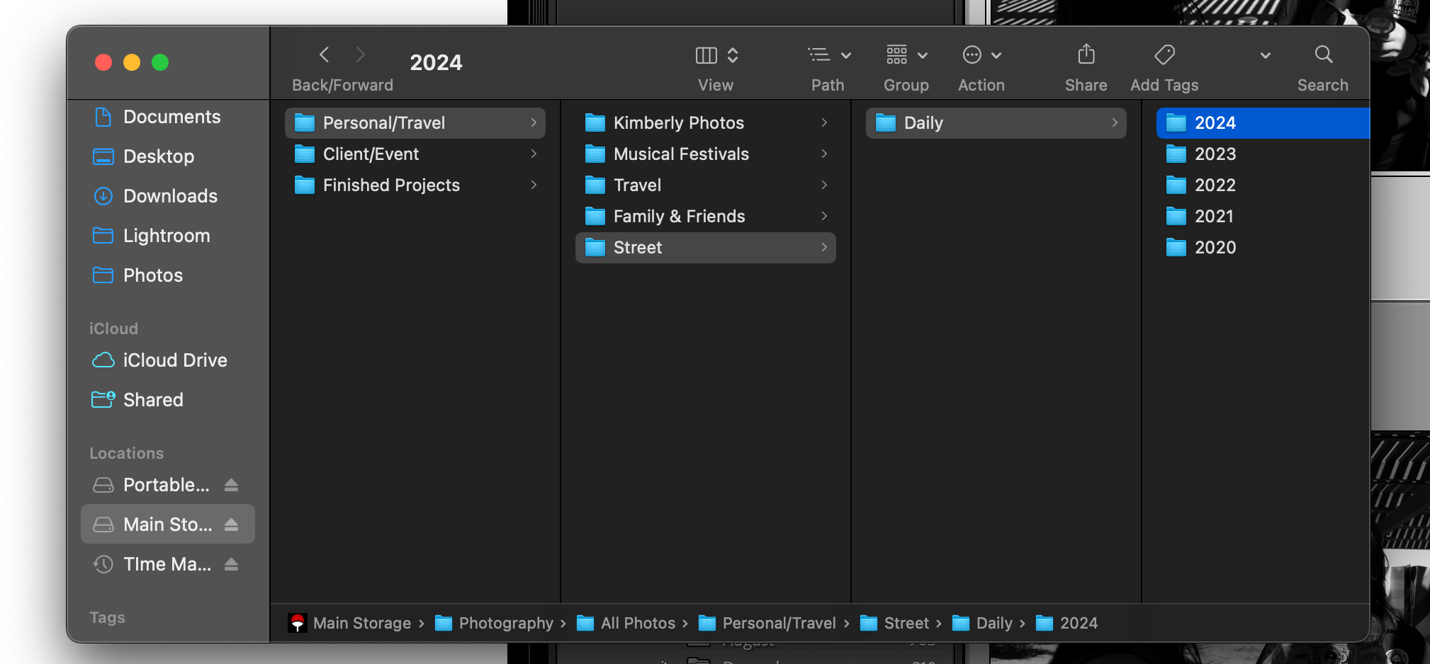 At the organization's core, having a solid and consistent folder system is essential. Now, I separated it via areas and then into sub-categories. I have two location-specific folders for specific organizations—personal/Travel and Client/Event. My personal/travel photos include travel, Musical festivals, my partner Kimberly, family & friends, and the street. In my street photography, I regularly take pictures organized by year/month/day.