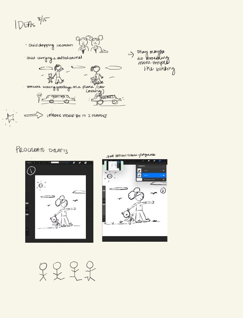 When brainstorming ideas of what to draw for my animation, I felt I needed help because it was harder than I thought. I first wanted to draw a person walking with their bear, then I changed it to a little girl’s face-changing expression and tried drawing someone walking. However, I noticed the difficulty in precision needed to draw people in motion You can see this below through the multiple drafts I went through.
