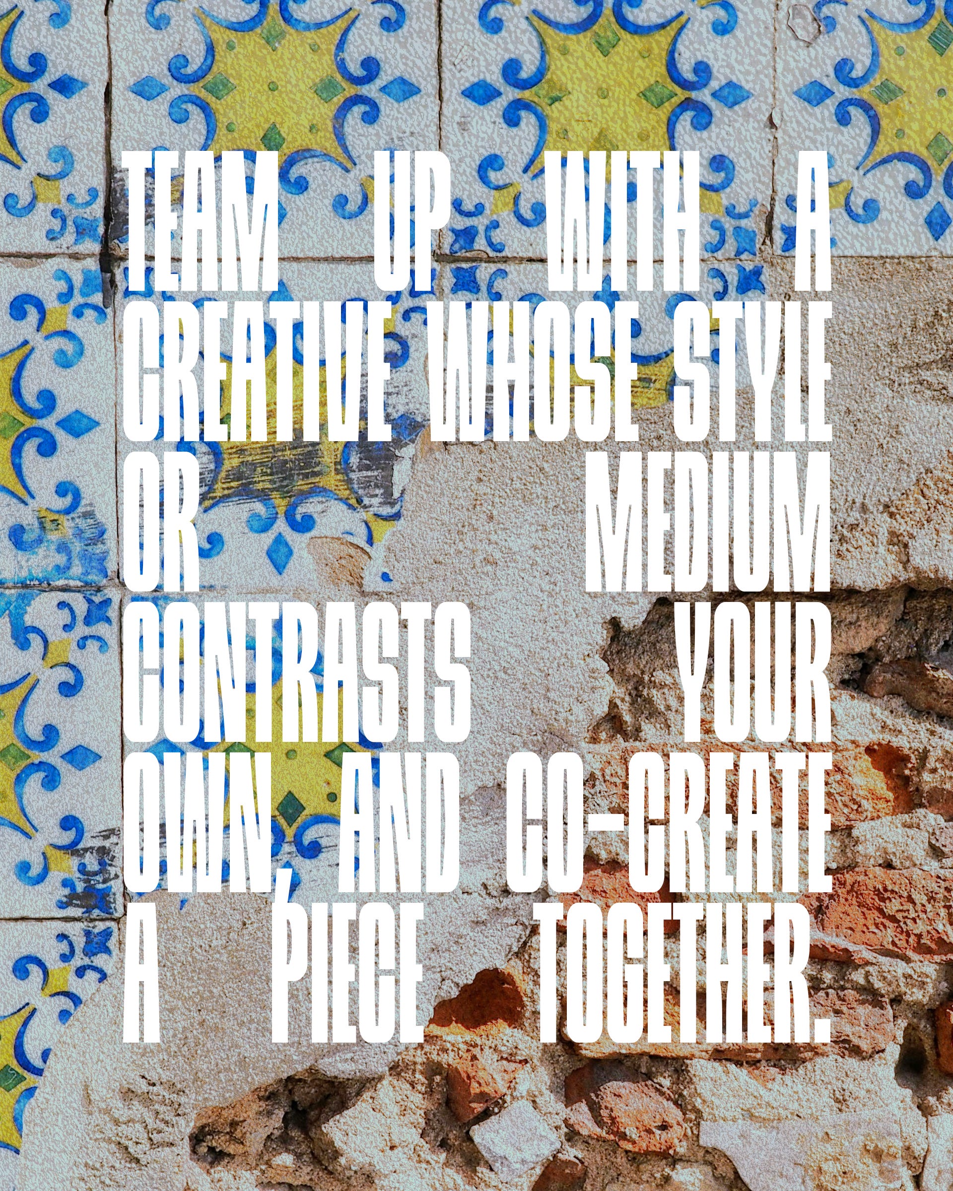 Find a creative who’s nothing like you—and make something only the two of you could create together. Let contrast guide you. Let opposites collide.